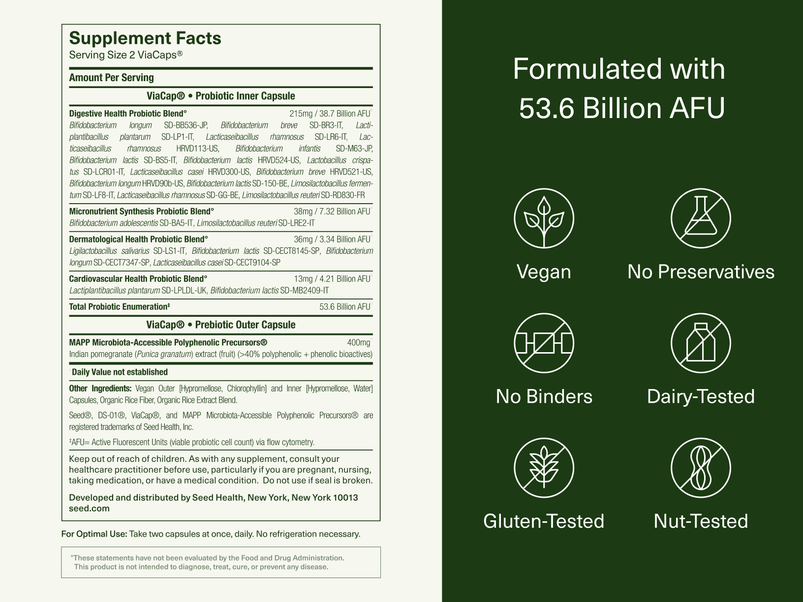 Skip generic probiotics and untested blends. Seed DS-01 Daily Synbiotic delivers targeted, science-backed support with clinically studied probiotic strains and prebiotics that nurture your gut, skin, heart, and immune health from within. Designed for optimal absorption and stability, each capsule promotes balance, resilience, and everyday well-being. Take daily. Thrive naturally.
